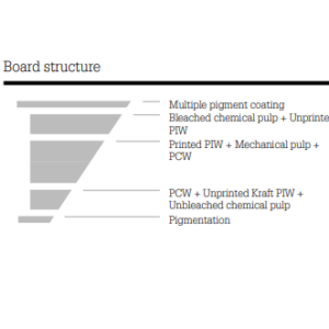 Grafopak is coated chipboard. The topside is white, the backside is grey. The topside contains primary fibres of whitened chemical pulp and non-printed recycled paper. The centre plies are made of mechanical pulp and printed recycled paper. The backside is made of printed recycled pape